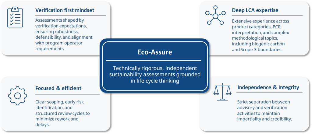 Eco-Assure is focused on technically rigorous, independent sustainability assessments grounded in life cycle thinking. Our work is shaped by hands-on experience across complex LCA, EPD, and verification engagements, with a strong emphasis on methodological clarity and audit-ready outcomes.